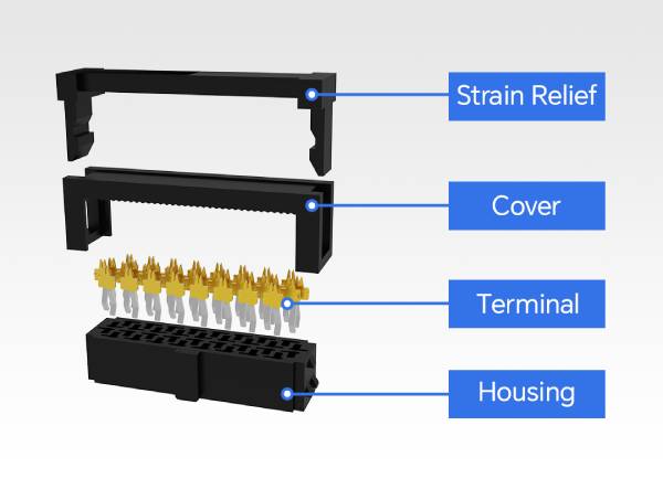 IDC W/T 应力消除装置,其中应力消除盖可消除应力,防止电缆因振动或外部拉动而松动,并增强公头和母端配接期间的机械稳定性。